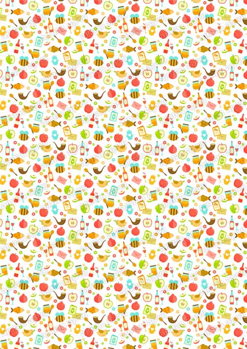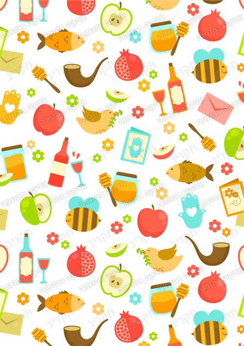 פרחים, דבורים, רימונים, ועוד, ערבוביה שמחה של כל סמלי החג.