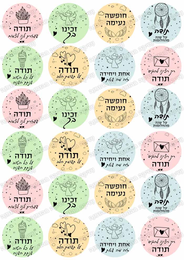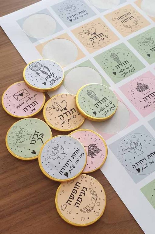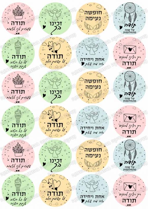 דף מדבקות, מושלם למגוון מתנות. קוטר כל מדבקה 4 ס”מ. 24 מדבקות בדף.